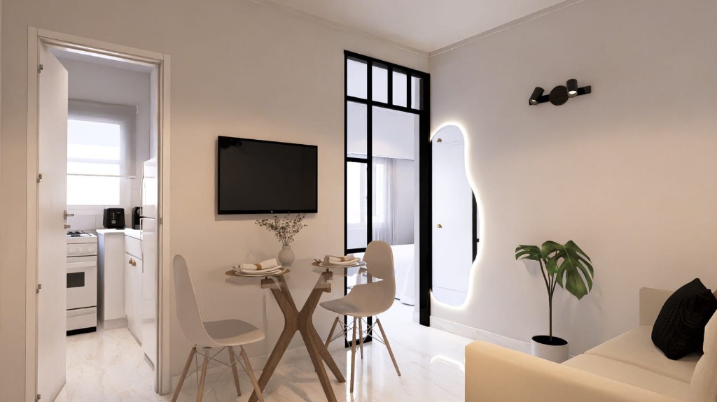El departamento cuenta con - Living en L a la calle con balcon terraza piso porcelanato, sistema de calefacción por aire, abertura DVH.- Balcón terraza vista única a Plaza San Martin 40 m2 - Cocina separada, revestida en porcelanato, abertura DVH, amoblamiento de cocina a medida, lavarropa , cocina y caldera.