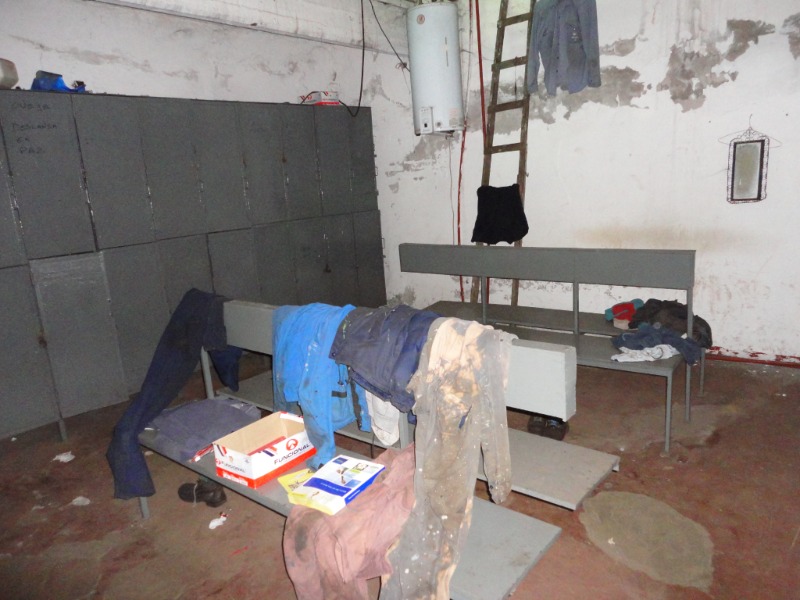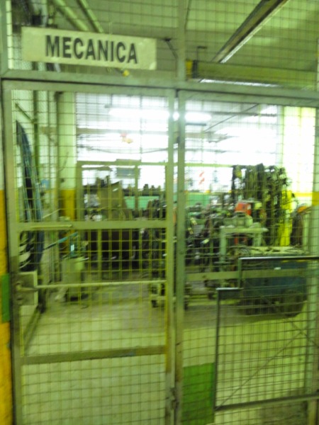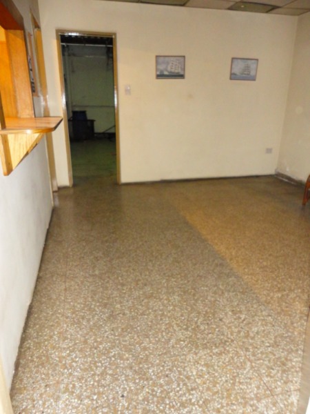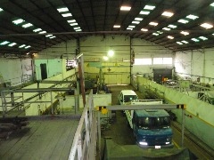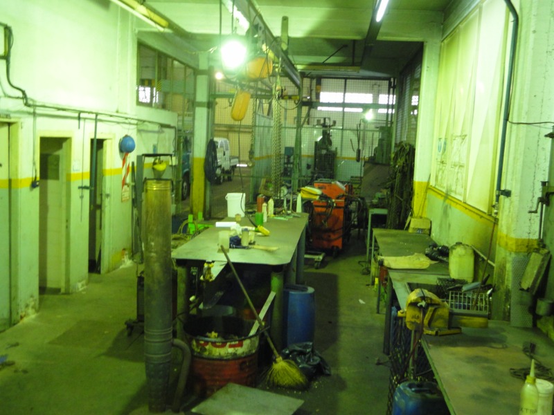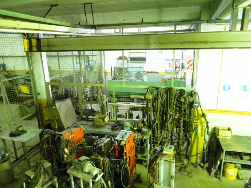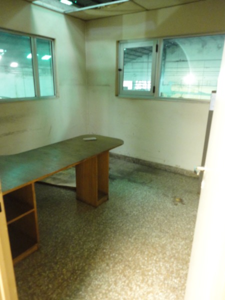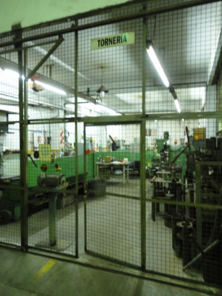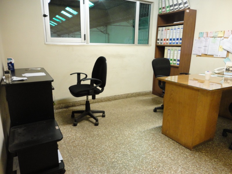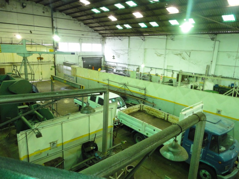 Piso de hormigón para grandes pesos; entrada de camiones altos; vestuarios, duchas y baños para personal; planta alta sobre losa, escalera de hormigón, con oficinas, privados, archivo y baños.