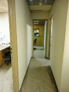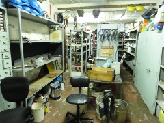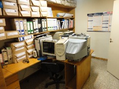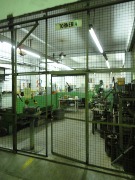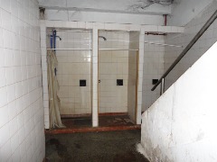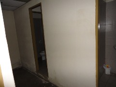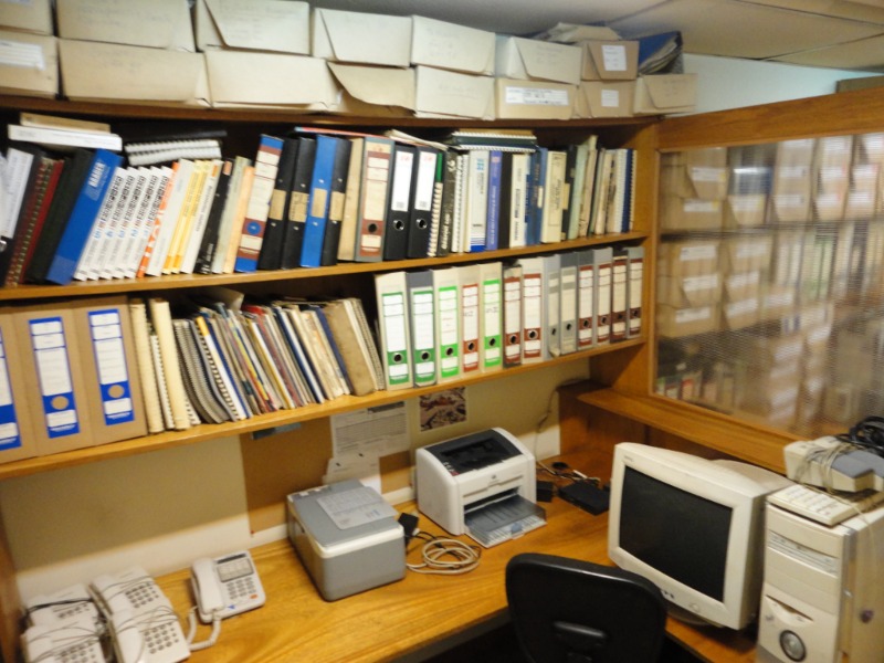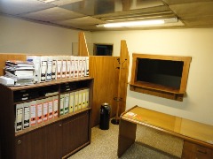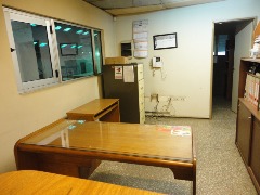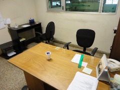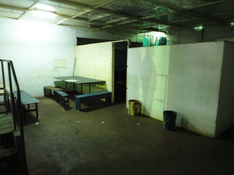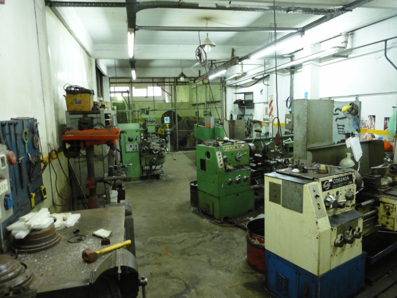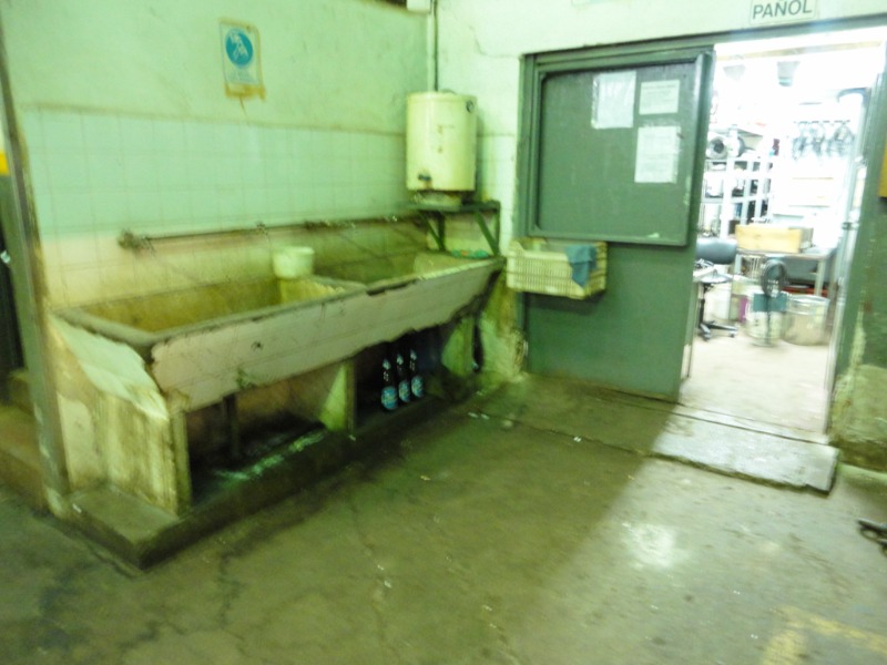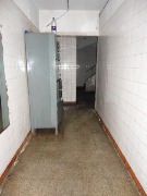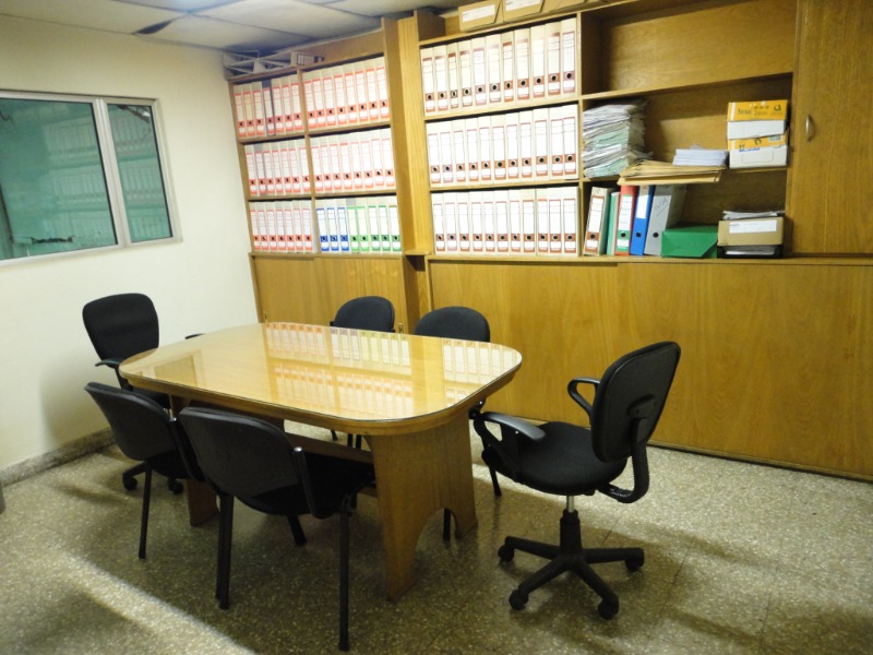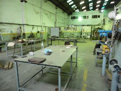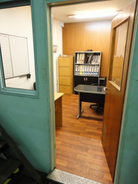 Piso de hormigón para grandes pesos; entrada de camiones altos; vestuarios, duchas y baños para personal; planta alta sobre losa, escalera de hormigón, con oficinas, privados, archivo y baños.